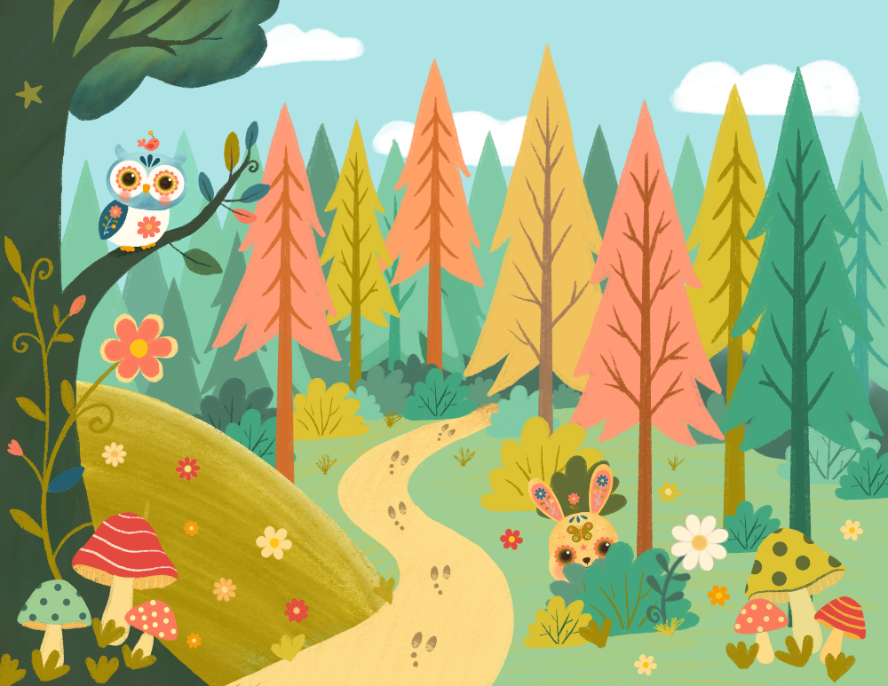 Whimsical woodland art inspired by curiosity, play, and cozy forest adventures.